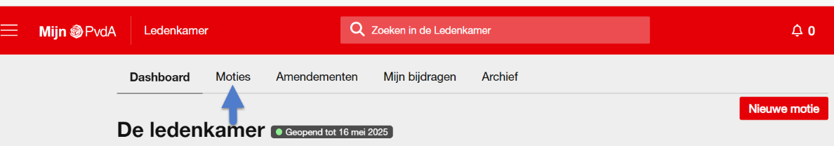 Voor een nieuwe motie klik je Nieuwe motie. Wil je een motie steunen dan klik je op Moties.